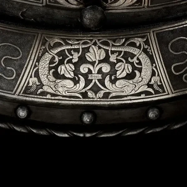 Доспехи украшены дельфинами, обращёнными друг к другу. Музей армии. Париж