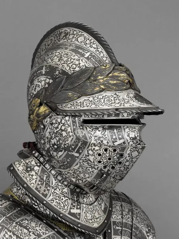 «Доспехи со львами» короля Франциска I. Шлем, наплечники и налокотники этого доспеха украшены чеканными мордами львов. Металлические поверхности также украшены насечкой. Музей армии, Париж