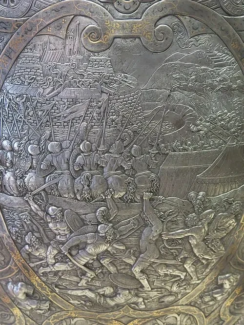 Став королем, Генрих II вкусам не изменил и заказал себе еще один комплект рыцарских доспехов из полированной стали с вычеканенными на них сценами Троянской войны. На первый взгляд они смотрятся беднее предыдущих доспехов, однако при внимательном рассмотрении становится очевидно, что для того, чтобы прочеканить все эти фигуры, требуется просто потрясающее мастерство. Недаром этот королевский доспех выставлен именно в Лувре.