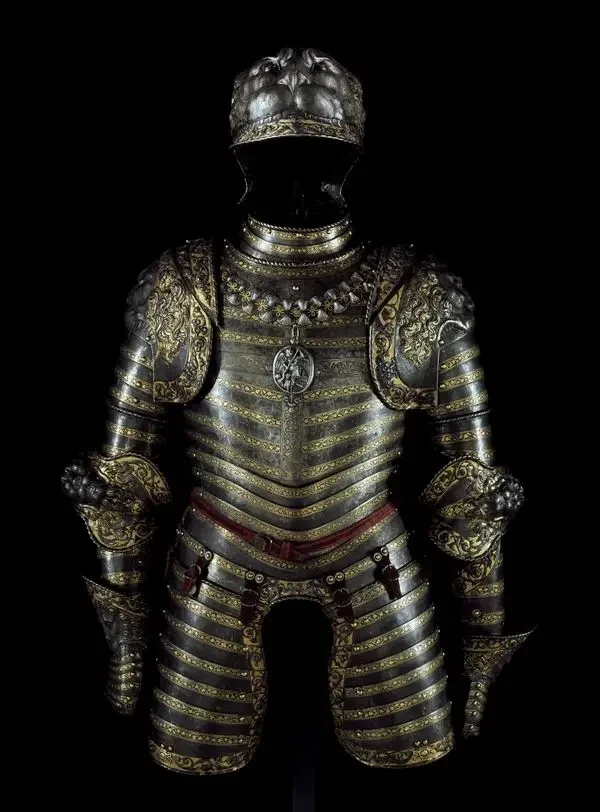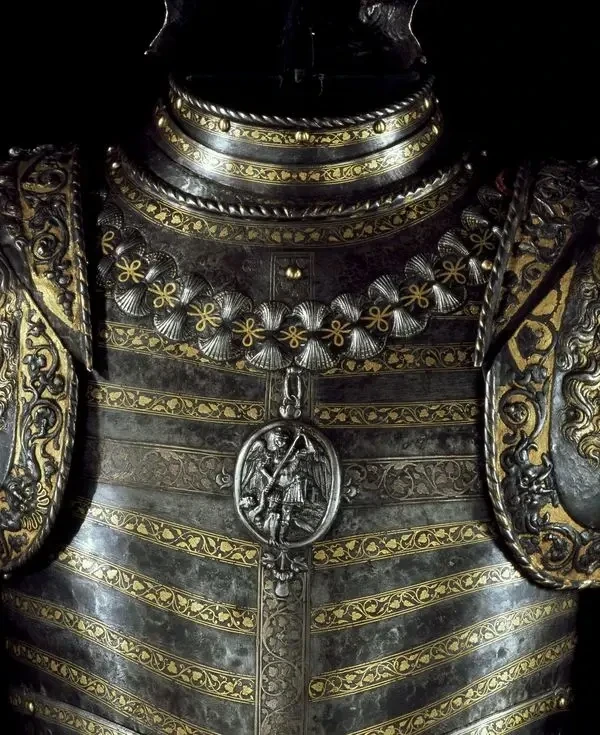 Обращает на себя внимание и воротник с орденом Святого Михаила – рыцарского ордена, основанного Людовиком XI, выполненный из металла на уровне груди. Узнаваемый по узорам в виде раковин, его медальон изображает архангела, который настигает демона, свернувшегося калачиком у его ног. Также серебряный крест на нагруднике явно указывает на мать Франциска I, Луизу Савойскую, принцессу Савойского герцогского дома. Датировка: около 1540-1545 гг. Вес доспехов составляет 16,2 кг. Мастер-изготовитель Джованни Паоло Негроли, миланский оружейник (1513–1569).