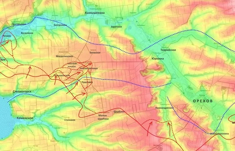 «Но, тем не менее, учитывая наше здесь преимущество, пускай и не подавляющее, я думаю, что мы возьмём Веселянку, Магдалиновку и Запасное, и далее выйдем на линию реки Конка и постараемся через неё переправиться, чтобы дальше двигаться уже на Запорожье и Юрковку для обрезания Орехова с западной стороны», - пояснил военный аналитик.
