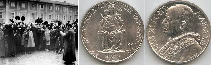 На фото слева: ватиканский священник зачитывает собравшимся людям текст Латеранских соглашений 11 февраля 1929 года. Фото: Keystone-France/Getty Images. На фото справа: после подписания Латеранских соглашений в 1929 году Ватикан начал выпуск собственных денег - ватиканской лиры, которая была привязана к лире итальянской. На крупных номиналах монет изображался правящий в то время понтифик Пий XI (1922–1939)