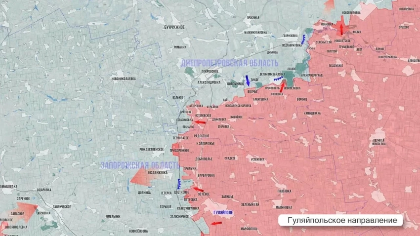 Особого внимания заслуживает Гуляйпольское направление. Здесь российские подразделения заняли ряд стратегически важных позиций у Староукраинки. Развивая успех, наши штурмовые группы выходят к южным окраинам Цветкового и поджимают противника с севера у Зализничного.