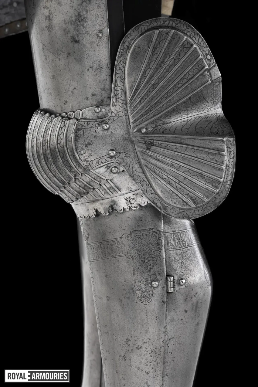 Наплечники из перекрывающих друг друга пластин стали отличительной особенностью мастерской в Гринвиче. Левый (если смотреть спереди) наплечник состоял из восьми полос, а вот правый почему-то из семи. Юбка состоит из девяти полос, как спереди, так и сзади. Петли на ней находятся слева, пряжки ремней справа. Латы для ног могли быть изготовлены в Италии или во Фландрии. Их попросту взяли от какого-то старого доспеха.