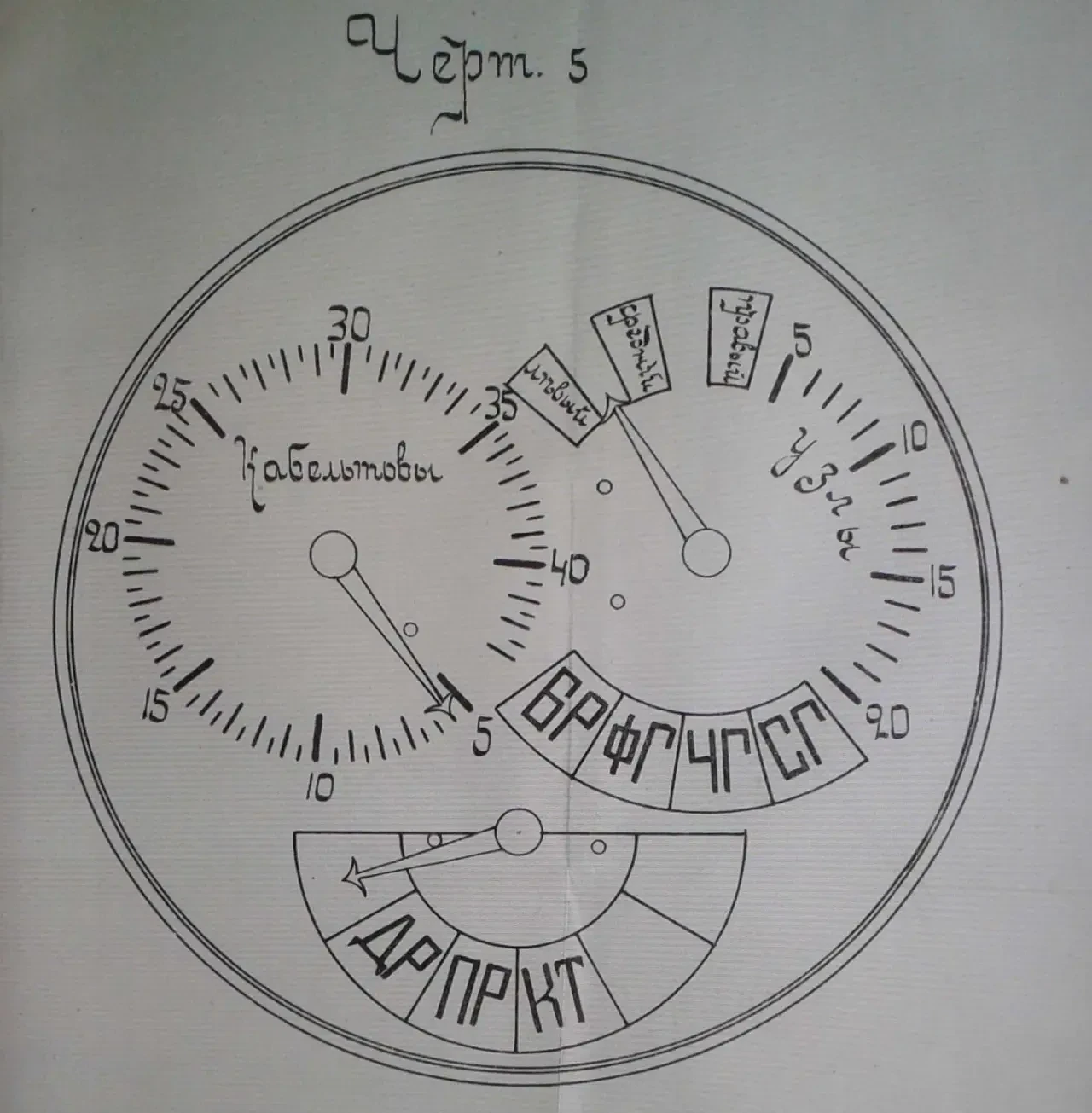 Стрелка расстояний – левая верхняя стрелка. С ней всё просто – она показывала расстояние с точностью до полукабельтова на дистанции 5 – 43 кбт.
