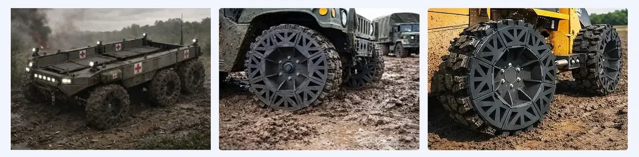 По словам производителя, сегменты колеса изготовлены из переработанной вулканизированной резины. Как утверждается, новая конструкция отлично сохраняет сцепление с различными типами поверхности и адаптирована к перемещению по сложной местности, например, по заснеженным путям или по грязевым дорогам, которые часто встречаются в прифронтовой полосе.