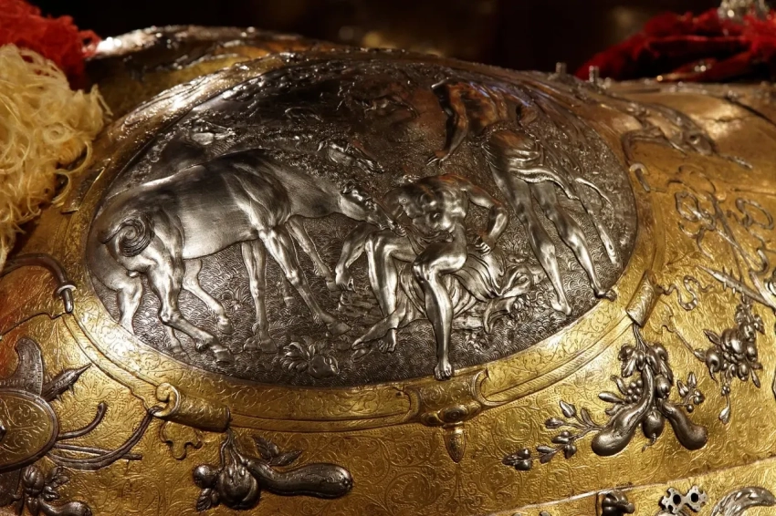 На передней пластине барда была изображена сцена кентавромахии – в древнегреческой мифологии битва, которая произошла из-за попытки похищения невесты Пирифоя на его свадьбе, в которой участвовал друг Пирифоя герой Тесей. Началась война, в которой победу одержали лапифы. Кентавромахия стала благодатным сюжетом материала для ряда античной литературы, ну и, разумеется, изобразительного искусства не только древности, но и Нового времени, буквально бредившего античностью. Суть же самого сюжета такова: кентавры были родственниками лапифов, однако они никогда не пили вина. А тут на этой свадьбе начали пить его, не разбавляя водой, напились и начали буйствовать – бросились похищать невесту и других женщин, за что им и досталось!