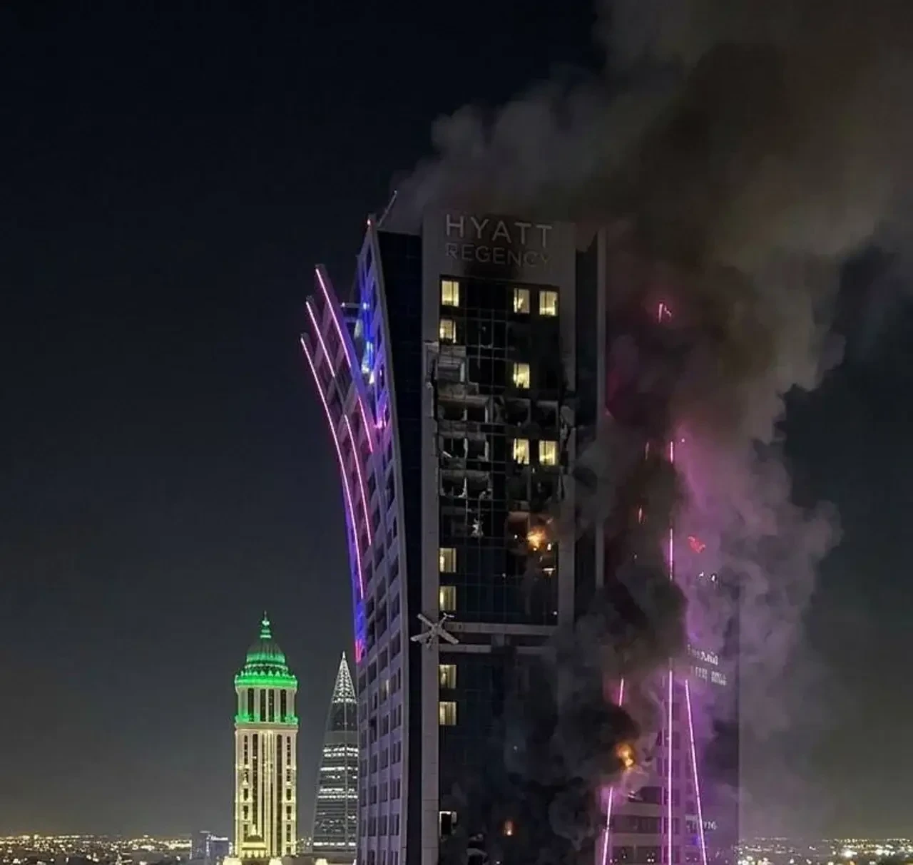 Местные СМИ утверждают, что высотка отеля загорелась в результате прилёта иранского БПЛА типа «Шахед». Выгорели номера на нескольких этажах. Пожар охватил практически всю многоэтажку.