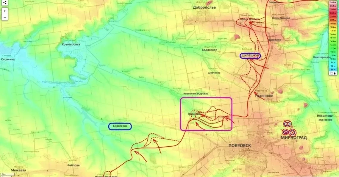 Российские подразделения продвигаются на линии Новый Донбасс - Белицкое - Гришино и усиливают давление на Сергеевку. Одновременно развивается наступление непосредственно на Константиновку. По приведённым данным, около 25% города уже контролируется российскими силами.