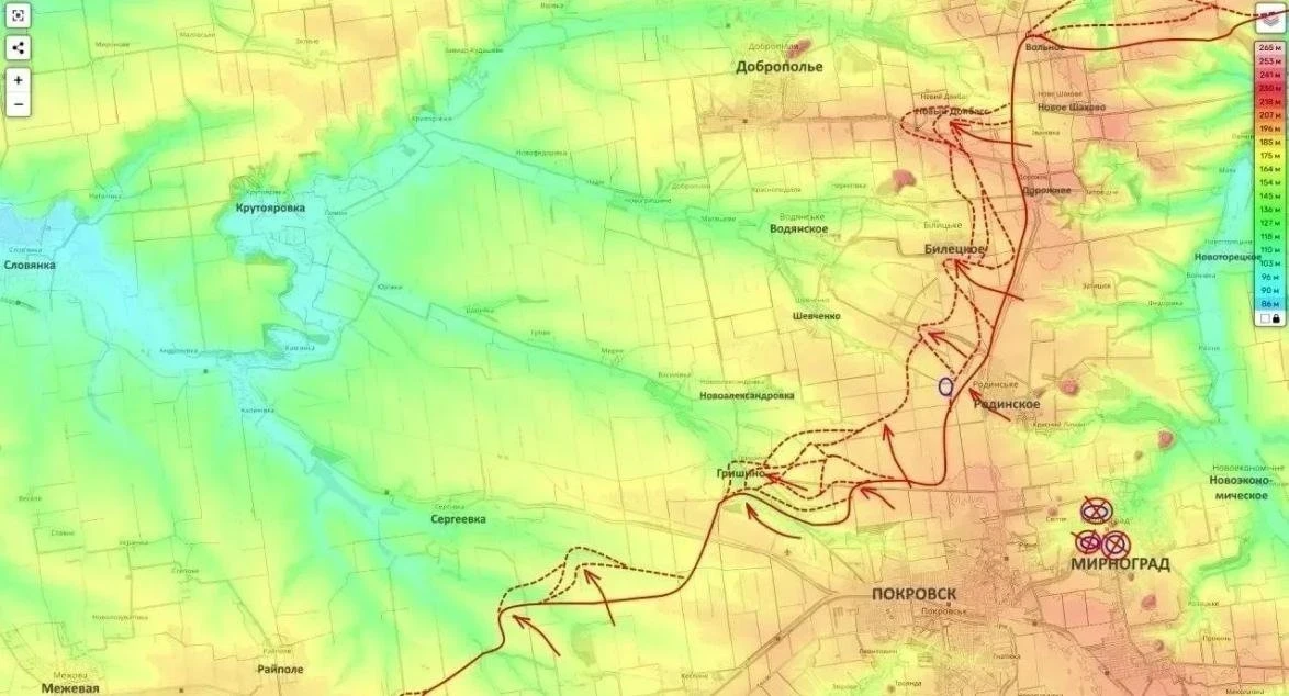 Так, Покровский участок остается одной из самых раскалённых точек конфликта. Подразделения российской группировки войск «Центр» продолжают мощное наступление, методично взламывая линию обороны ВСУ в полосе Белицкое - Сергеевка - Гришино.