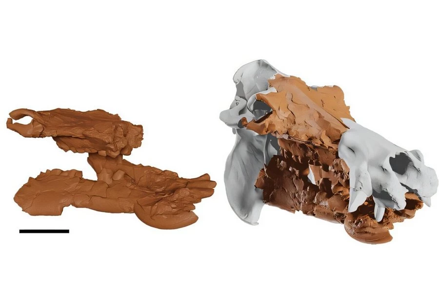 Используя эти методы, исследователи смогли в цифровом виде реконструировать весь череп H. creutzburgi, заполнив пробелы с помощью современной модели черепа бегемота.