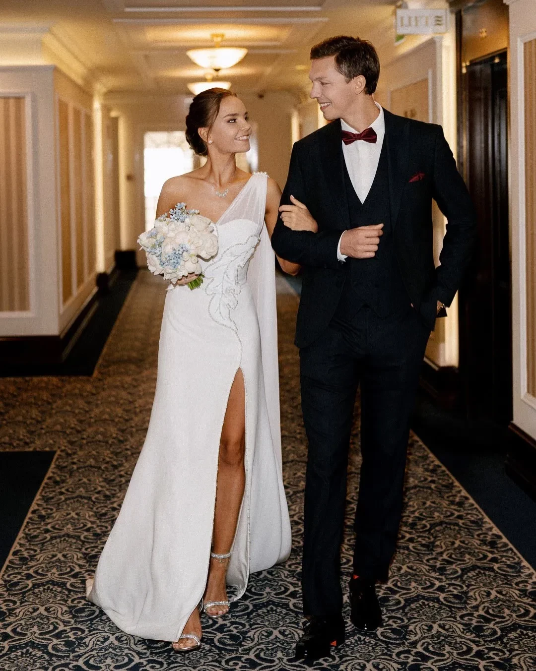 Сегодня в сети появились новые снимки со свадебной фотосессии и из ЗАГСа: фотосессия молодожёнов прошла в отеле "Балчуг Кемпински". На снимках невеста позирует в платье с разрезом бренда "Хохлома x Алёна Ахмадуллина" и в украшениях Mercury.
