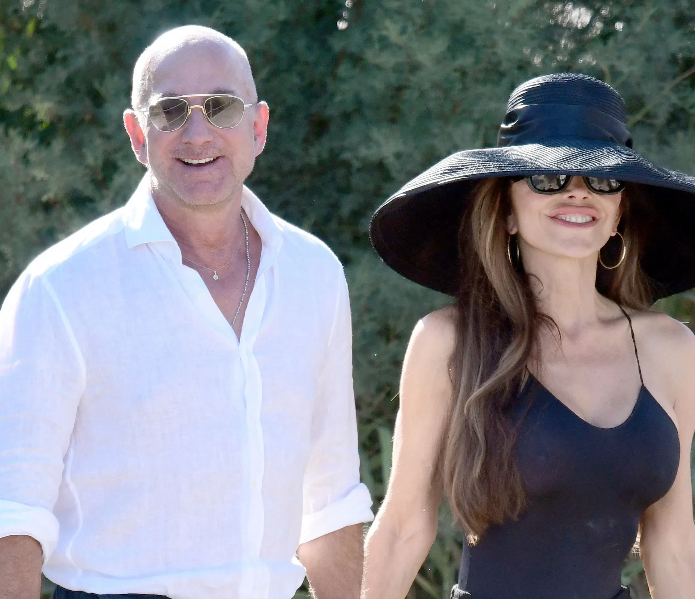 61-летний миллиардер и его 55-летняя жена улыбались фотографам и держались за руки, покидая местный пляжный клуб Club55. Лорен была одета в чёрный топ и прозрачную юбку макси, дополнив образ массивной шляпой, солнцезащитными очками, золотыми серьгами и поясом. Основатель Amazon надел синие брюки, белую рубашку и шлёпанцы.
