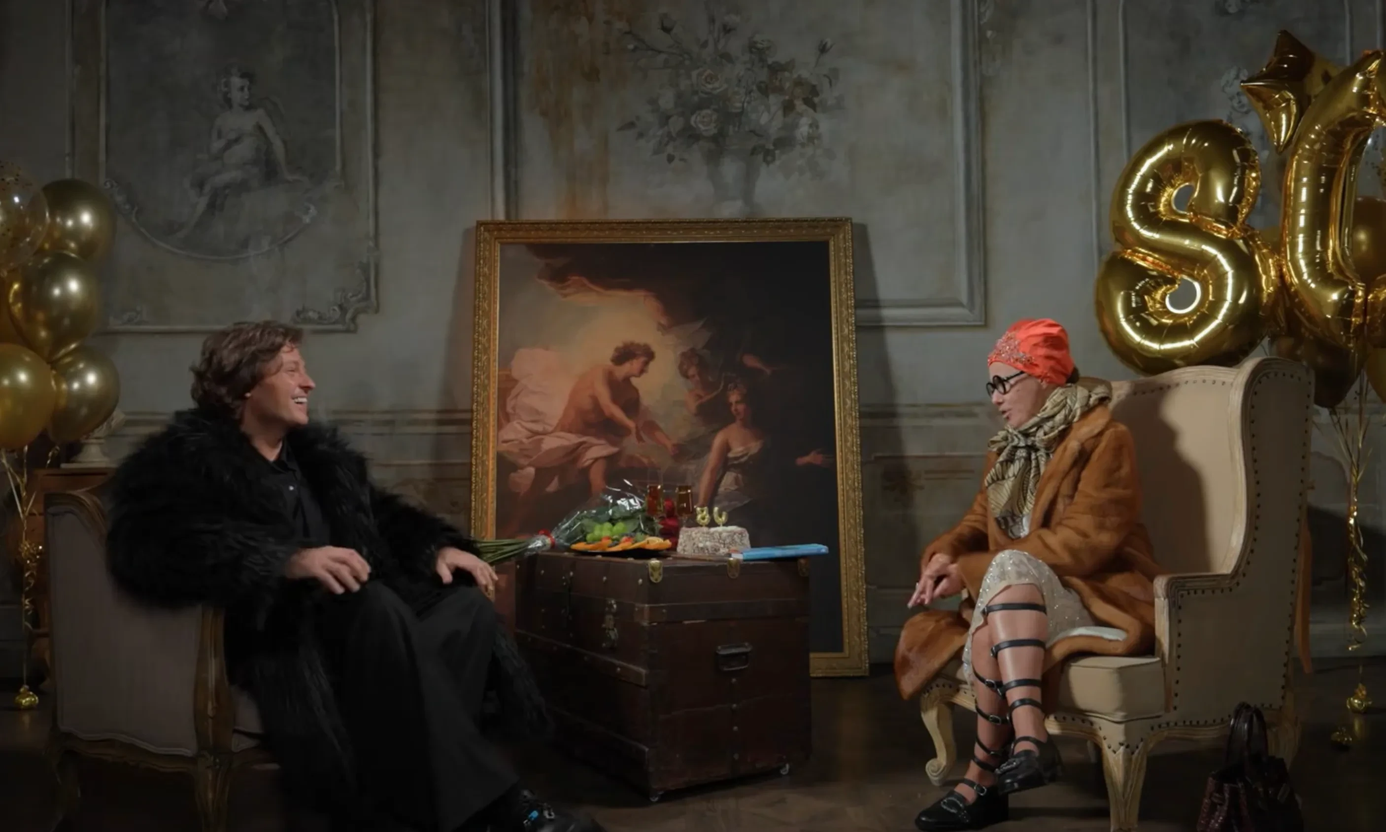 Ну оставим в покое Аллу Борисовну. Она для меня неоднозначная фигура, потому что, ну, страна всё дала Алле Борисовне. Не каждому всё дали. Не все добиваются таких успехов, и для меня она неоднозначна. Но в то же время я считаю, что не имею права как артист, который не достиг таких высот, унижать или публично её оскорблять.Прохор Шаляпин и Ксения Собчак (в образе бабушки)
