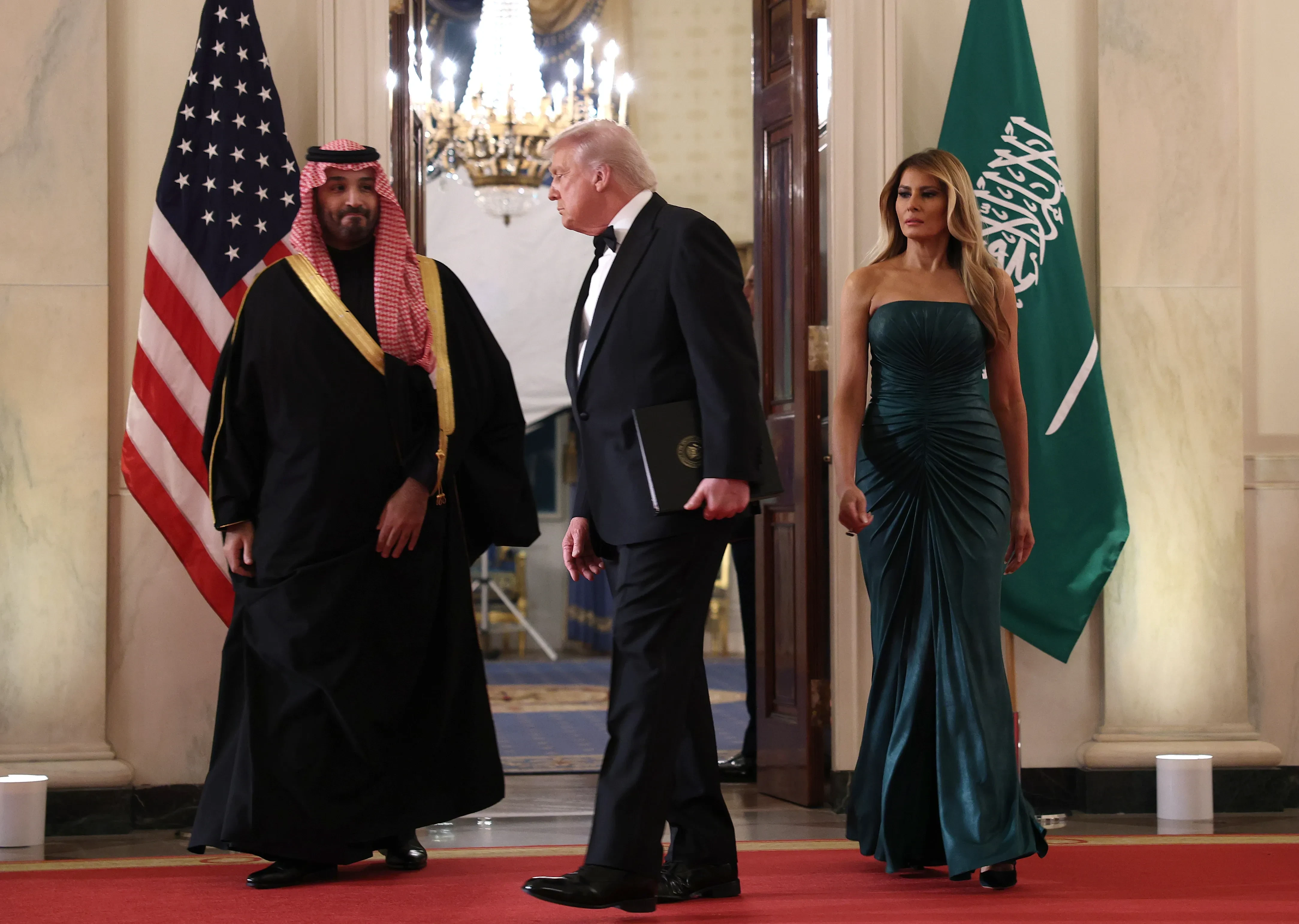 Мухаммед ибн Салман и Дональд ТрампМухаммед ибн Салман, Дональд и Мелания ТрампПриезд принца Саудовской Аравии вызвал большой общественный резонанс в США. Ранее американская разведка заявила, что Мухаммед ибн Салман одобрил убийство журналиста Джамаля Хашогги в саудовском консульстве в Стамбуле в 2018 году. Тогда журналист вошёл в здание консульства, чтобы забрать документ, необходимый для заключения повторного брака. Его невесту не пустили, она ждала Джамаля на улице до полуночи. Он так и не вышел из консульства, где его, по сообщениям СМИ, убили, а от тела избавились. Президент Турции Реджеп Эрдоган позднее заявил, что журналист был убит по политическим мотивам.