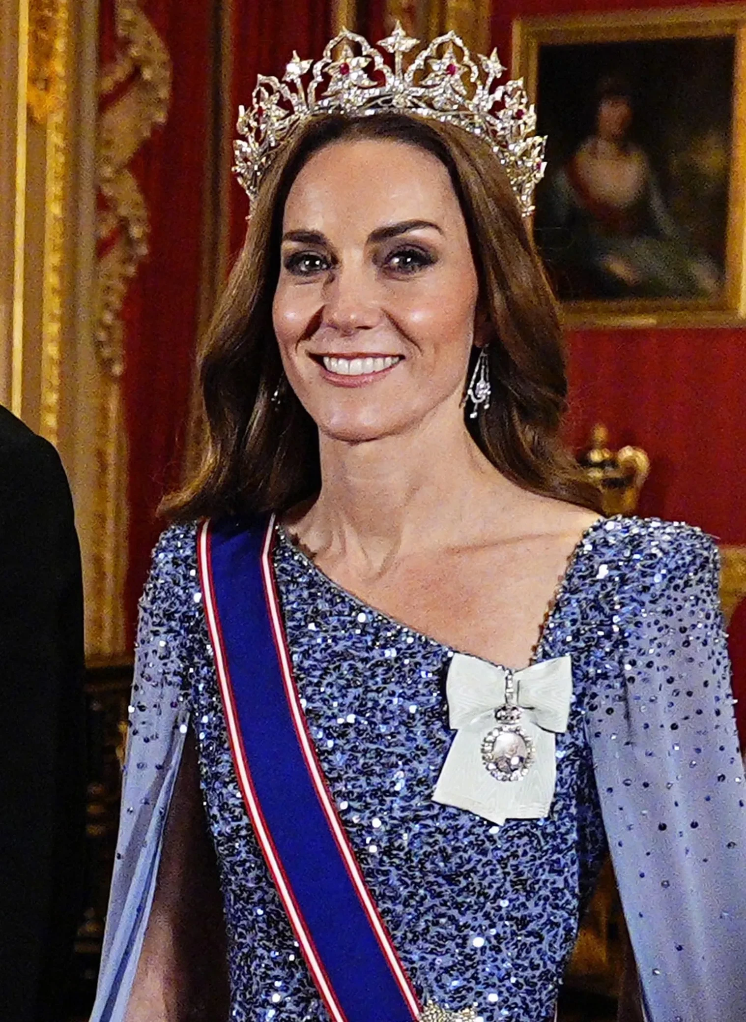 43-летняя Кейт Миддлтон появилась на банкете в платье из пайеток с кейпом от Jenny Packham, но больше всего внимания привлекла редкая тиара из коллекции королевы Виктории — самая большая из всех, что принцесса Уэльская когда-либо носила. Тиара Oriental Circlet была изготовлена в 1853 году: она украшена бриллиантами и рубинами в виде сверкающих лотосов и арок в стиле Моголов. Однажды в этом украшении выходила в свет королева Елизавета II — во время поездки на Мальту в 2005 году.