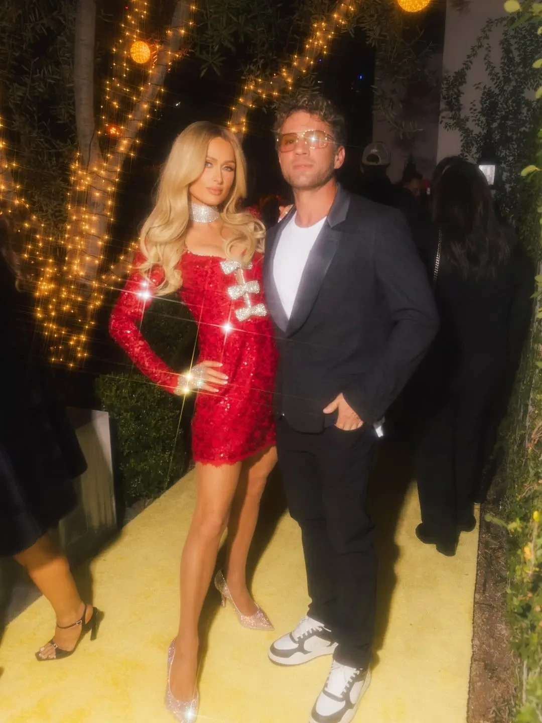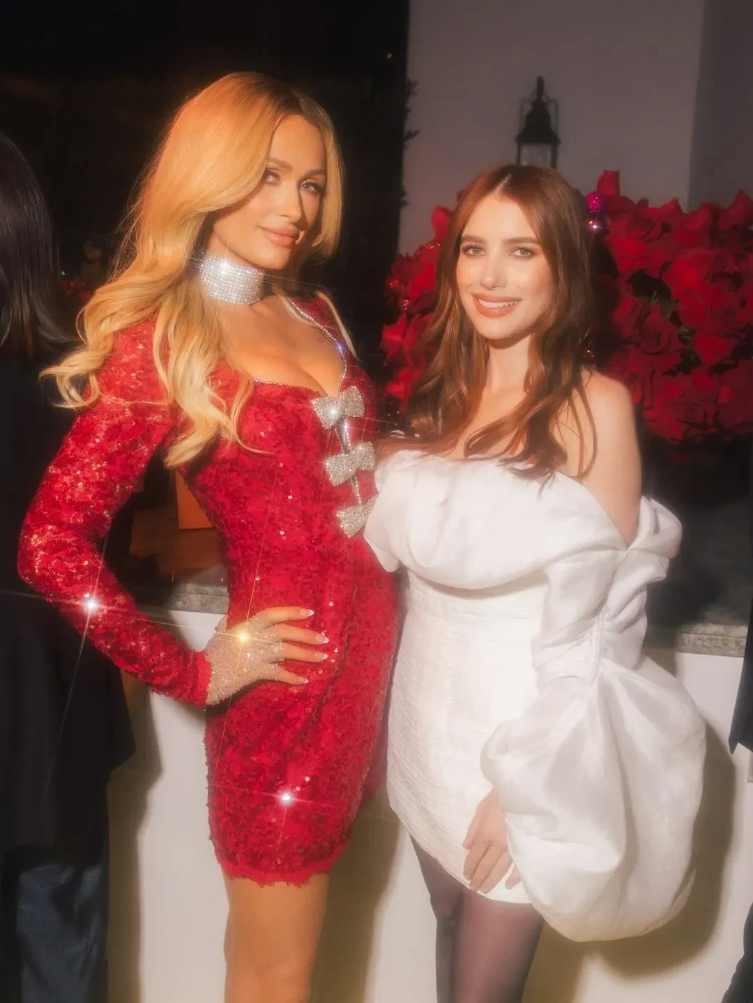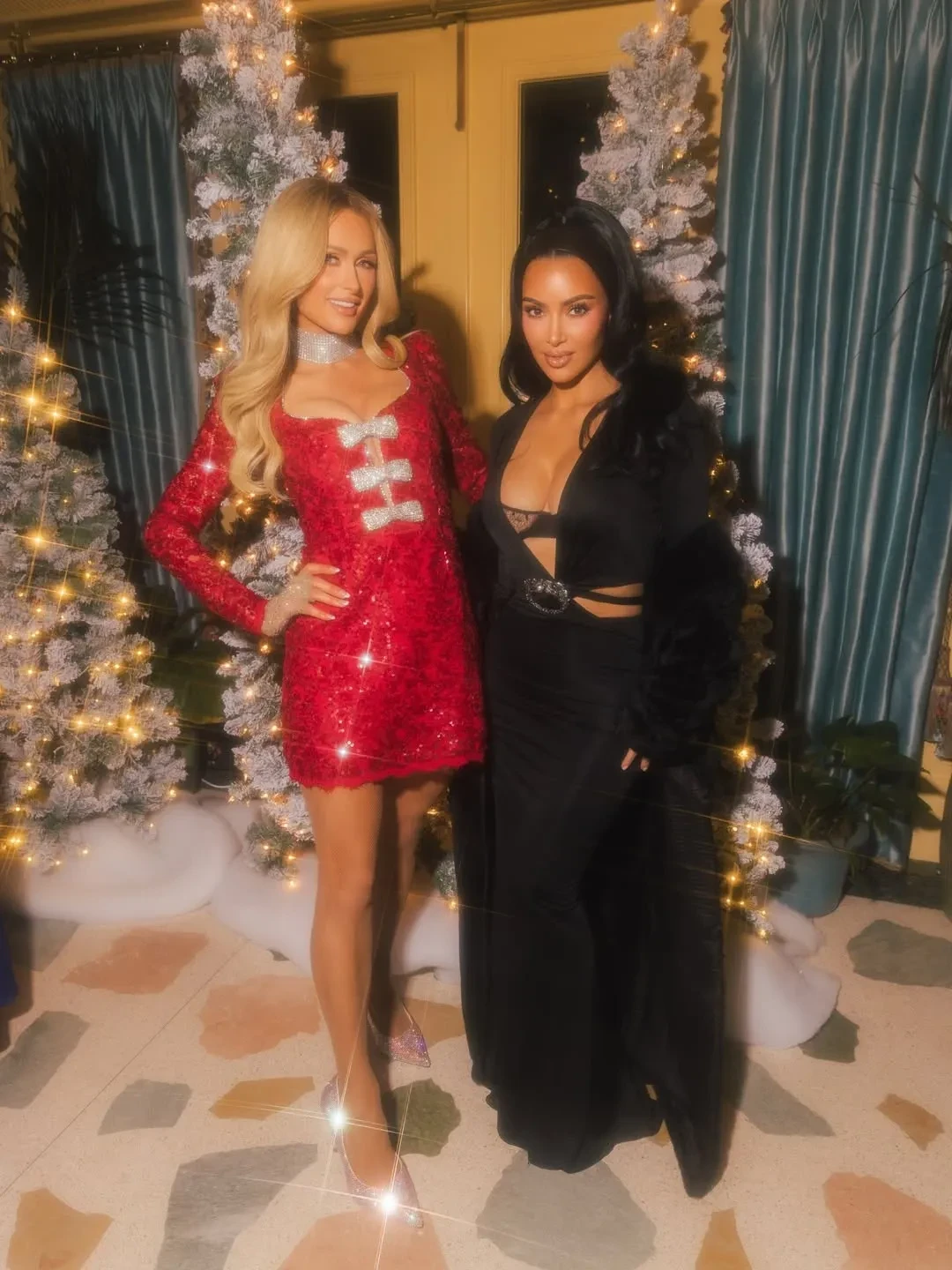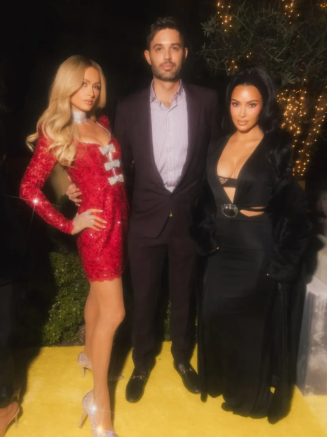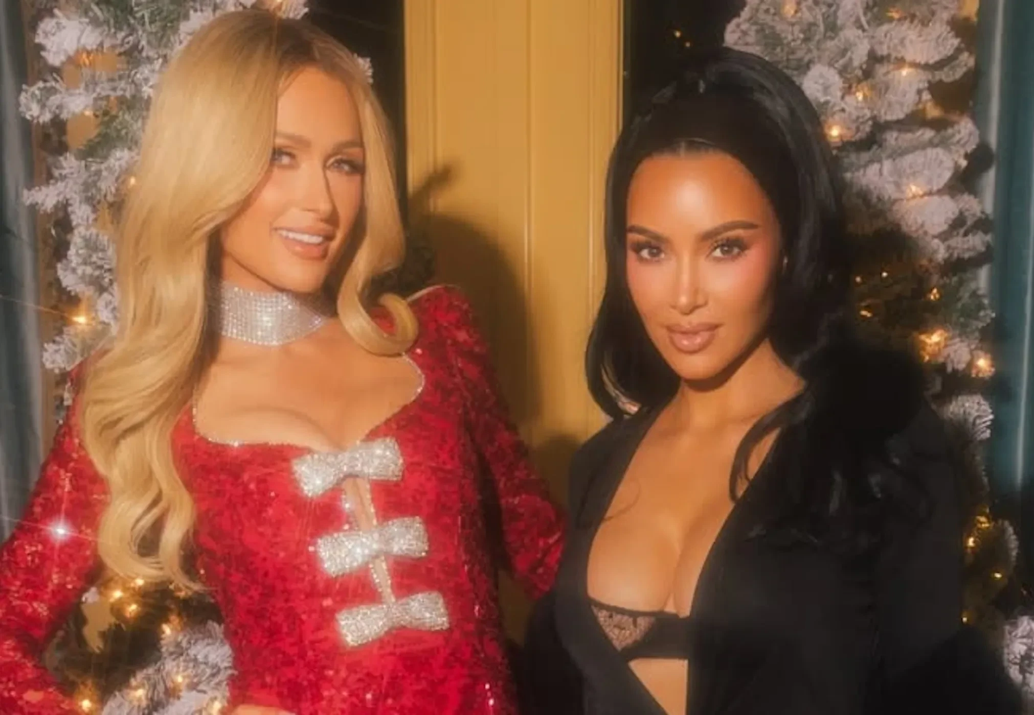 45-летняя Ким Кардашьян пришла в длинном чёрном платье с глубоким декольте, а 44-летняя Пэрис Хилтон позировала в красном мини-платье, дополнив образ блестящим чокером.