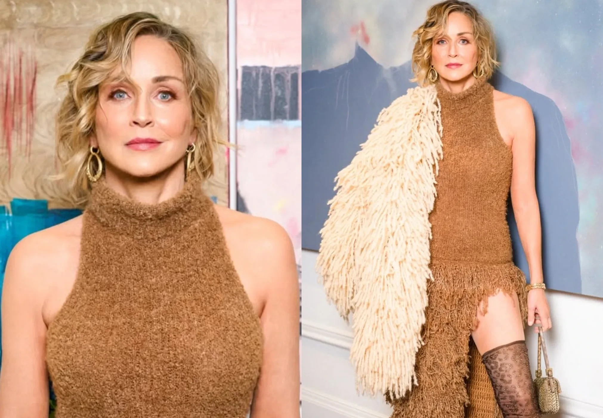 Шэрон Стоун посетила премию Astra Awards 2026 в Лос-Анджелесе. На мероприятие 67-летняя актриса надела платье с разрезом, шубу Zuleyha Kuru и ботфорты Gedebe с леопардовым принтом. Перед выходом Стоун сделала несколько фотографий в образе на фоне своих новых картин.