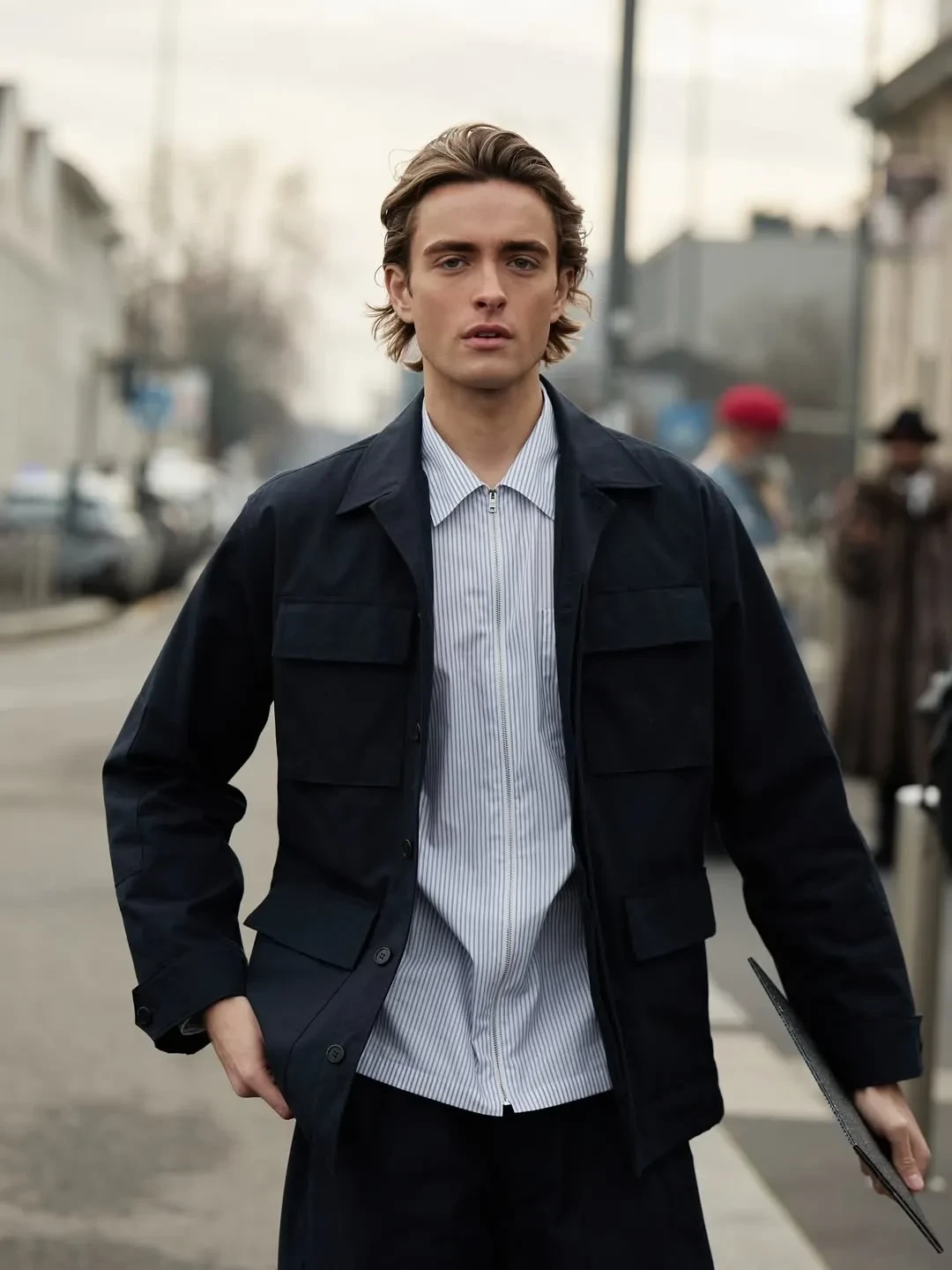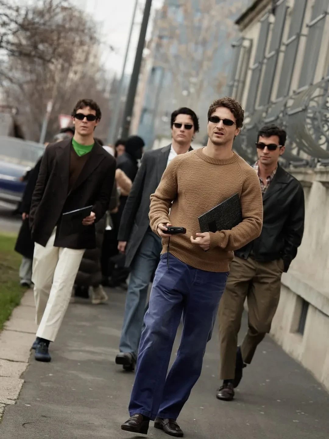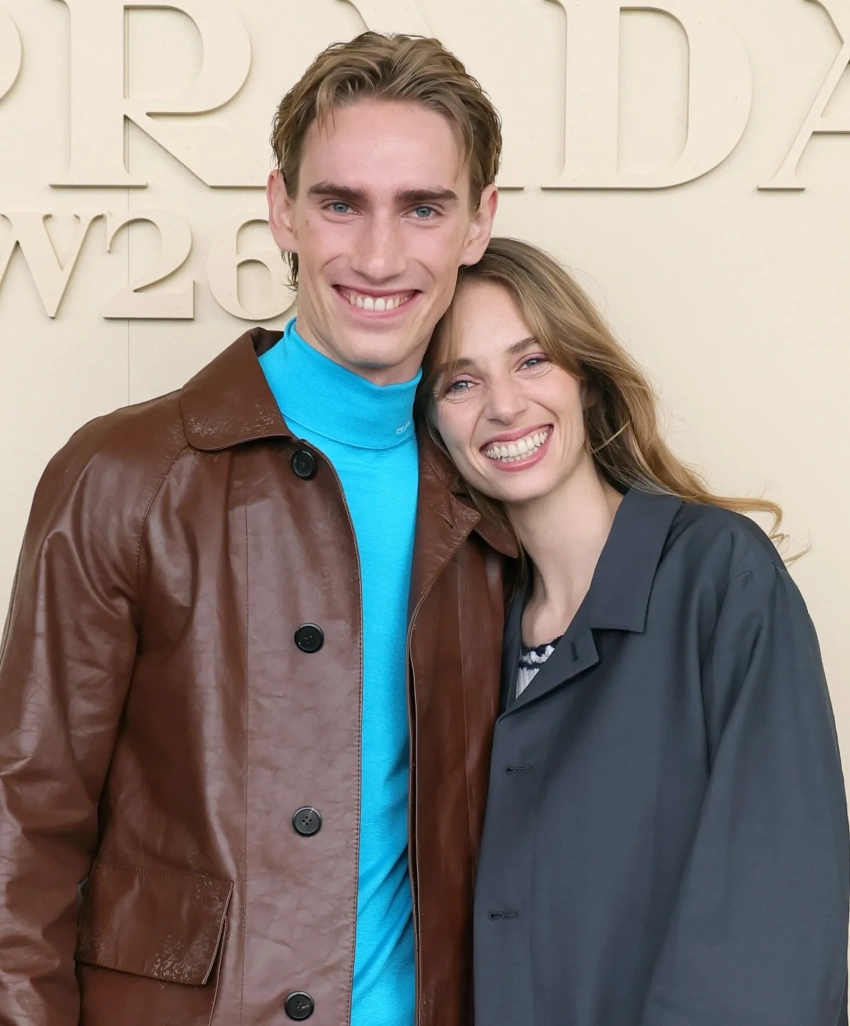 27-летняя звезда сериала "Очень странные дела" Майя Хоук пришла на шоу в сером пальто и шортах, а её 24-летний брат Левон позировал в кожаном пиджаке и голубой водолазке. Александр Рогов примерил тотал-лук Prada из летней коллекции, а Оксана Бондаренко выбрала образ в серых оттенках.