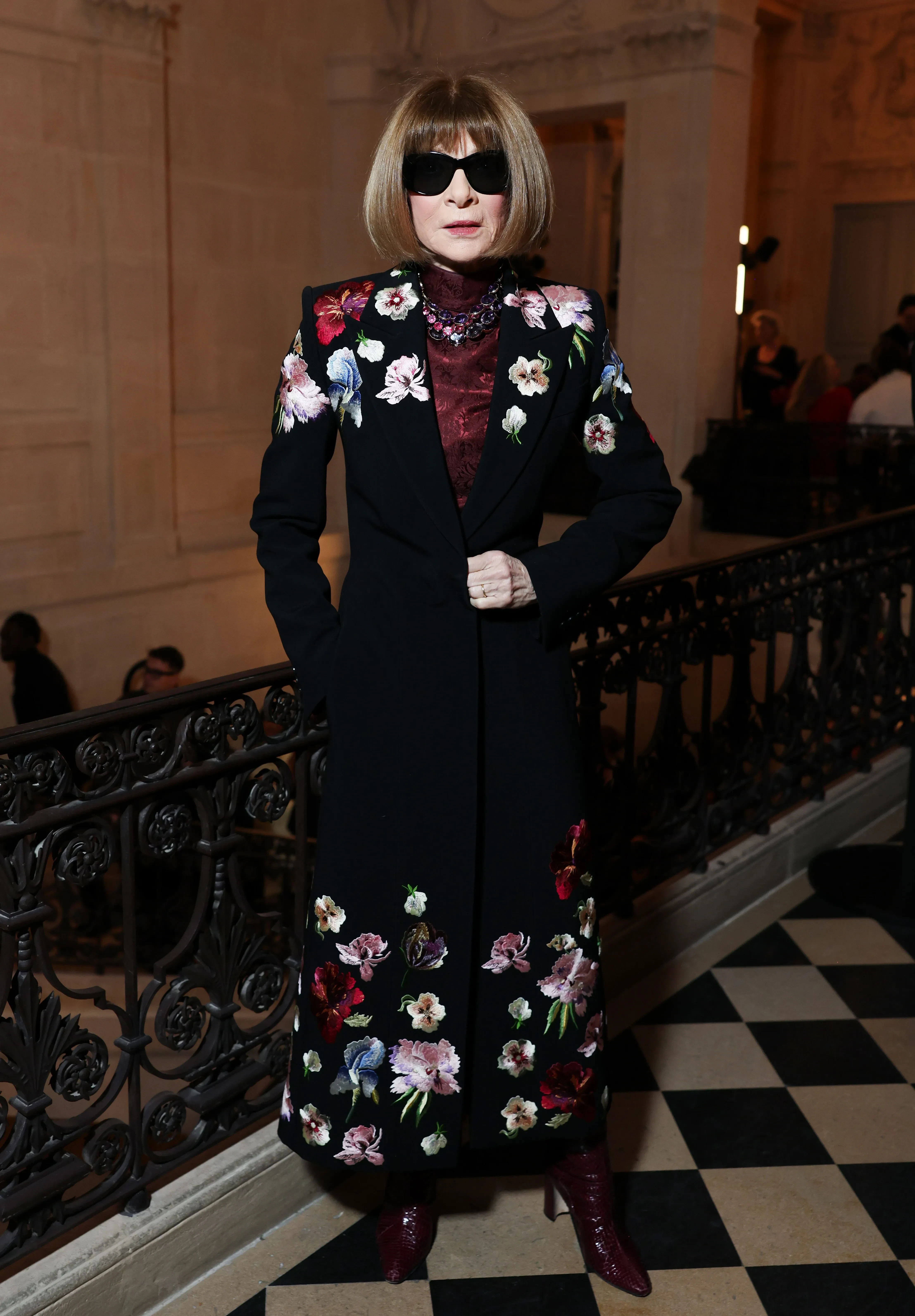 28-летняя модель и бывшая жена Венсана Касселя Тина Кунаки пришла на показ в чёрном платье с декольте, а 76-летняя Анна Винтур надела пальто с цветочной вышивкой. Звезда французского кино Софи Марсо, которая в этом году отметит 60-летний юбилей, позировала в кожаной юбке и дублёнке.