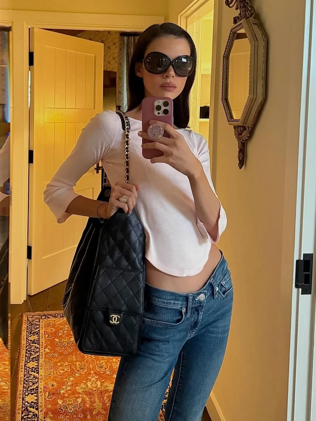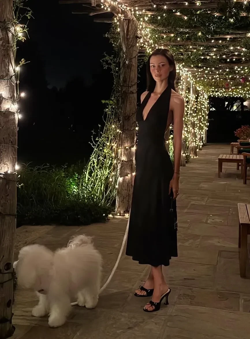 На фото пара ужинает в доме, отдыхает у камина, гуляет по территории и наслаждается обществом друг друга и их собаки. На ужин Никола надела платье с открытой спиной, а также примерила несколько повседневных образов.