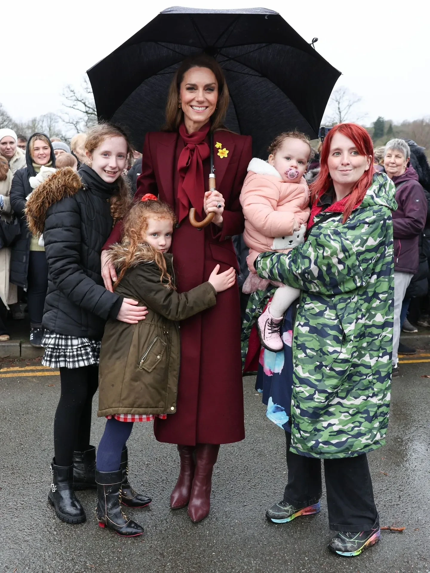 Для визита 44-летняя Кейт выбрала образ в бордовых оттенках: она была в любимом красном пальто от Alexander McQueen, которое уже не раз носила на публике, блузе с бантом, макси-юбке и высоких лакированных сапогах. 43-летний Уильям предпочёл коричневый пиджак, синий джемпер и брюки прямого кроя. На груди у пары красовались одинаковые броши в виде нарциссов — символа святого Давида, который традиционно носят в день праздника как знак уважения к валлийскому наследию.