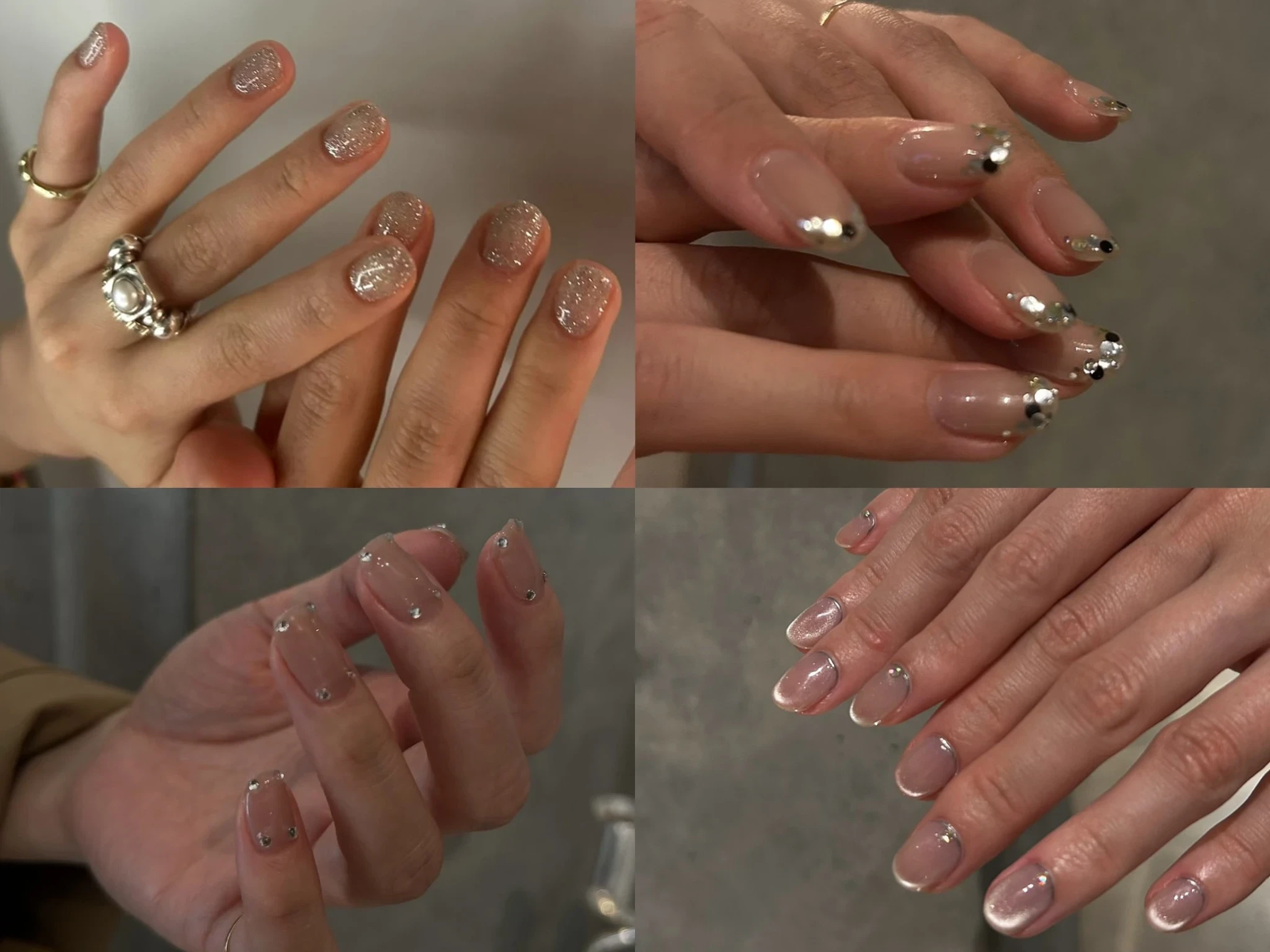 Нюдовая база плюс стразы, пайетки, металлические линии или россыпь глиттера — и маникюр сразу выглядит актуально, но не перегружено. Такой дизайн идеально подойдет для повседневных образов с модным настроением.