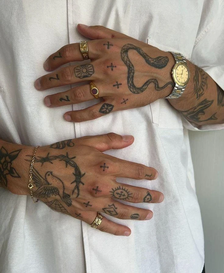 Татуировки в виде перстней — едва ли не самый детализированный язык тюремной символики. Здесь значение имеет всё: форма, орнамент, конкретный палец, фаланга, дополнительные элементы.